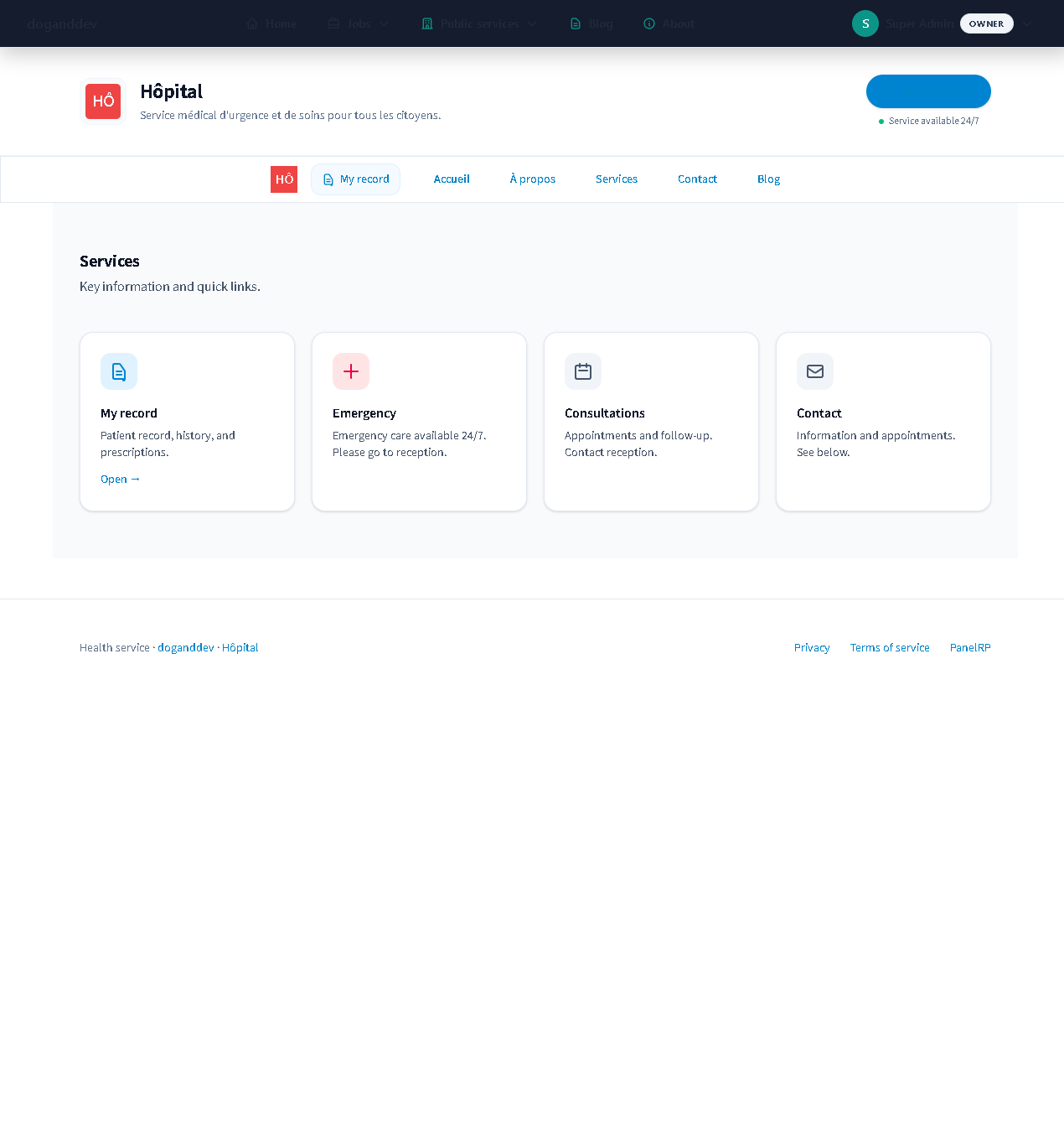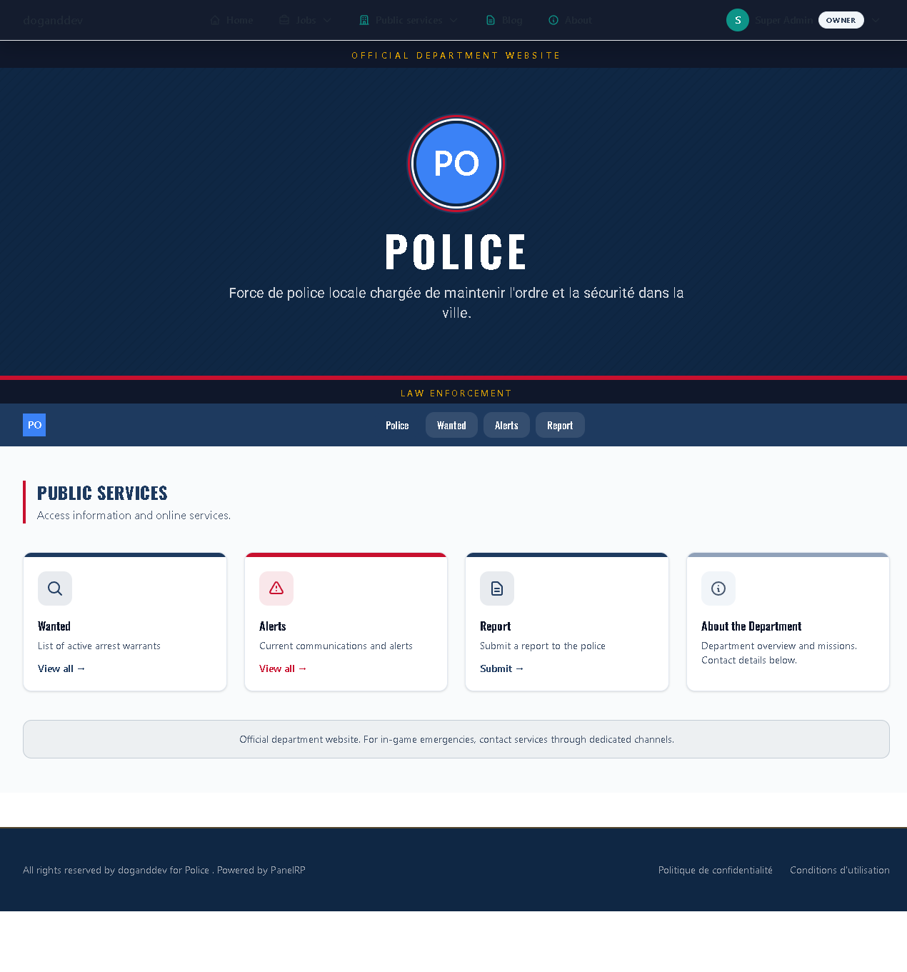 PanelRP is a multi-tenant roleplay server management panel for FiveM, GTA RP, SAMP, Minecraft and RedM: it lets administrators manage their server and staff (dashboard, police and hospital MDT) and gives players access to dedicated sites (real estate, classifieds, government, newspaper) from in-game.