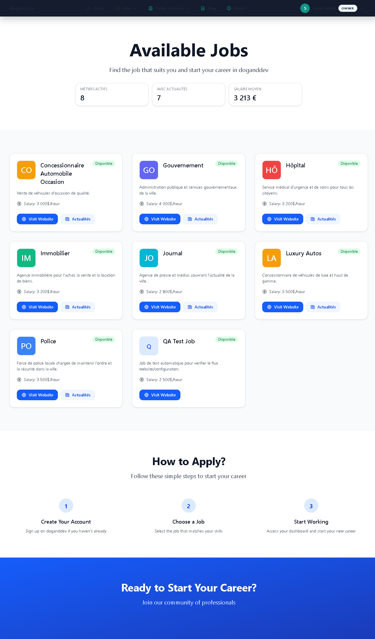 For server administrators: monitor activity and equip police and hospital. For in-game players: browse public city sites. For you: customize with modules (whitelist, logs, ban, businesses, jobs).